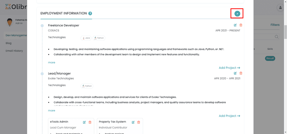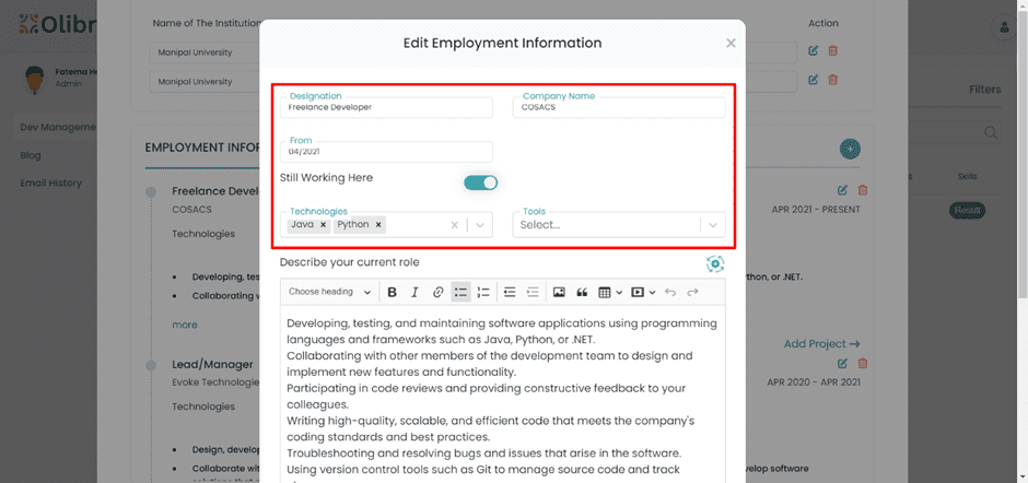 Step-6: Include your employment history by listing each company you’ve worked with, your designation, duration of employment, and the technologies and tools used. This will create a clear picture of your professional experience.